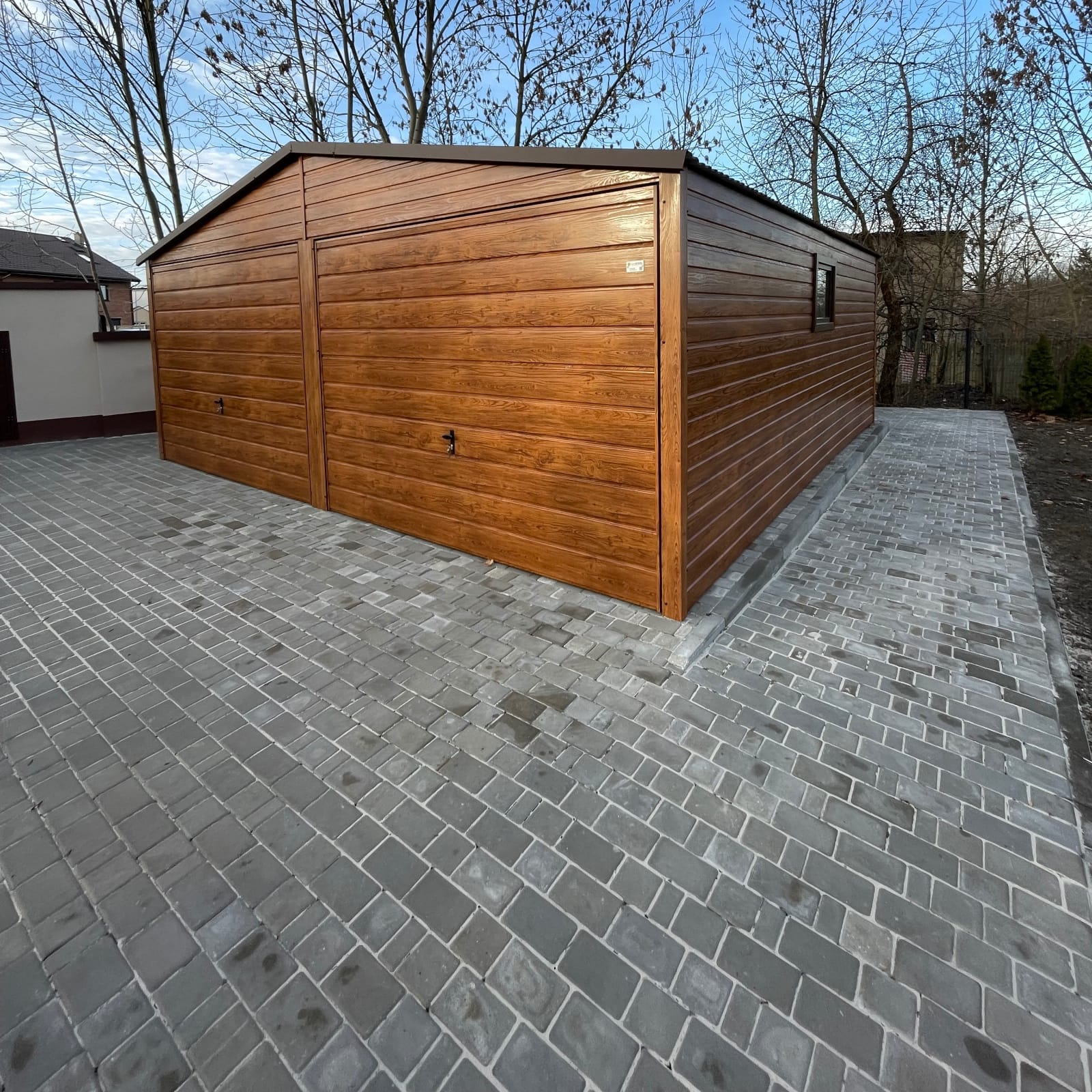 Garáž dostala súpravu oplechovania, ktoré nielen zlepšujú vzhľad, ale aj zvyšujú ochranu stavby pred poveternostnými podmienkami. Drevený povrch spôsobuje, že budova harmonicky splýva s okolím pozemku a zároveň zvyšuje vizuálne hodnoty celého priestoru.