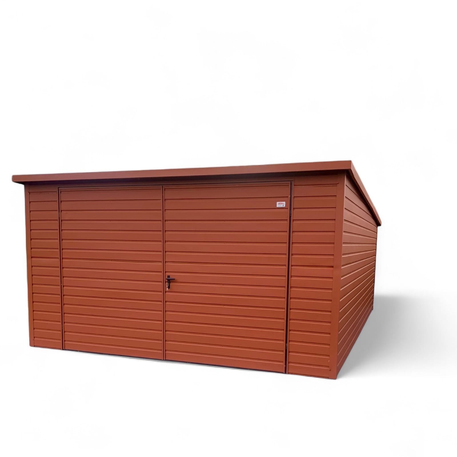 Plechová garáž Premium 3x6 je vyrobená z trapézového plechu vo farbe dreva zlatý dub. Konštrukcia garáže je založená na pevných oceľových rámoch z dutých profilov a uhlov. Celá konštrukcia je chránená antikoróznym náterom. Jednostranná strecha je pokrytá trapézovým plechom v rovnakej farbe. V prípade silných dažďov ľahko odvedie vodu z povrchu. Garáž má krídlovú bránu s rozmermi 275x195cm v zlatom dube. Na otvorenie brány môžeme dodatočne nainštalovať automat s diaľkovým ovládaním, ktorý nám poskytne komfort používania. Plechovú garáž Premium je možné použiť aj na uskladnenie rôznych druhov záhradného náradia. Zmestí sa do nej kosačka na trávu, malý záhradný traktor, zariadenie na pestovanie záhrady. V priestrannej miestnosti je tiež dostatok miesta na umiestnenie pracovného stola. Garáž má lemovanie, ktoré je celou povrchovou úpravou garáže