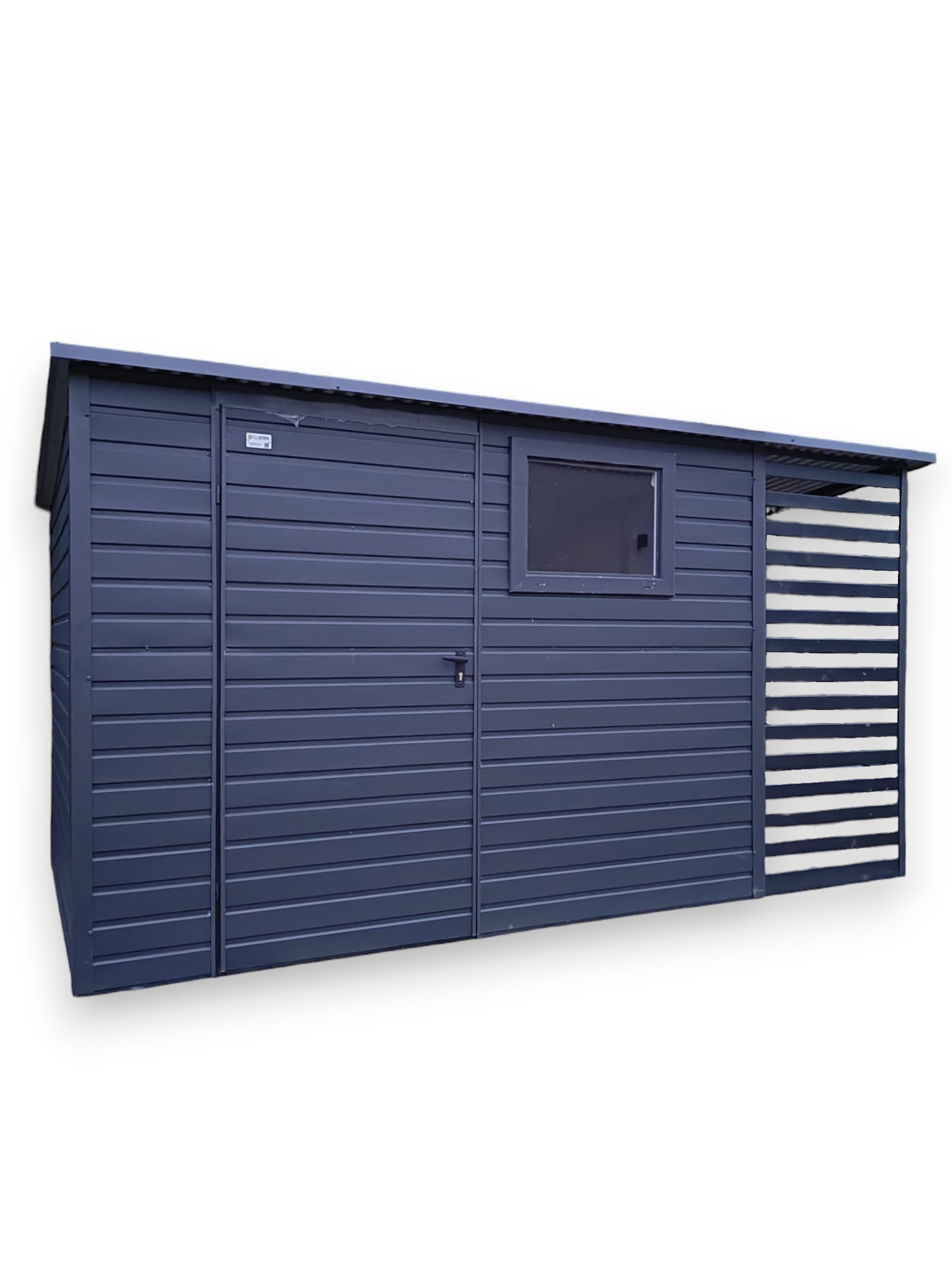 Záhradný domček 4x3m z trapézového plechu pozinkovaného v grafitovej farbe. Strecha konštrukcie je jednostranná do zadnej časti domu pokrytá trapézovým plechom. V prípade silných dažďov alebo sneženia je ideálnou ochranou konštrukcie. Záhradný domček je navyše vybavený plastovým oknom s rozmermi 80x60. Zaisťuje veľmi dobré denné osvetlenie miestnosti v zamračených dňoch. Je ideálny na uloženie záhradného náradia, ako je kosačka na trávu, fúrik, záhradný nábytok alebo gril či bazén. Dá sa použiť aj ako úložný priestor na pneumatiky alebo bicykle. Kvalitná antikorózna farba poskytne ochranu pred hrdzavením kovových profilov po mnoho rokov. Záhradný domček ochráni všetky predmety v ňom uložené pred nepriaznivými poveternostnými podmienkami v lete aj v zime. Jednokrídlové vchodové dvere z grafitu ochránia pred nežiaducimi hosťami. Vo vnútri miestnosti môžeme police umiestniť podľa nášho vkusu a veľkostí. Zvyšný priestor je možné využiť s pracovným stolom pre domácich majstrov. Výhody záhradného domčeka sú predovšetkým: