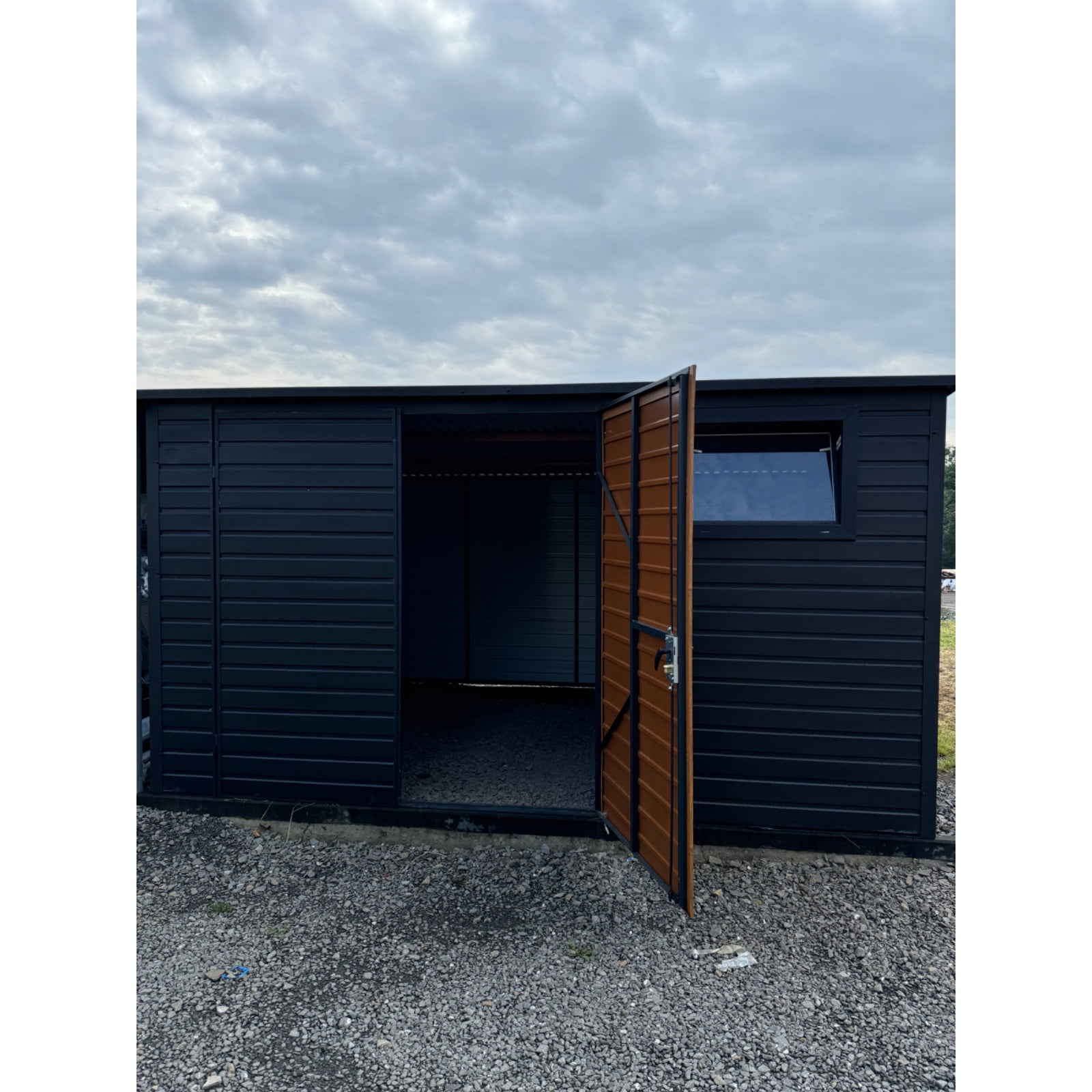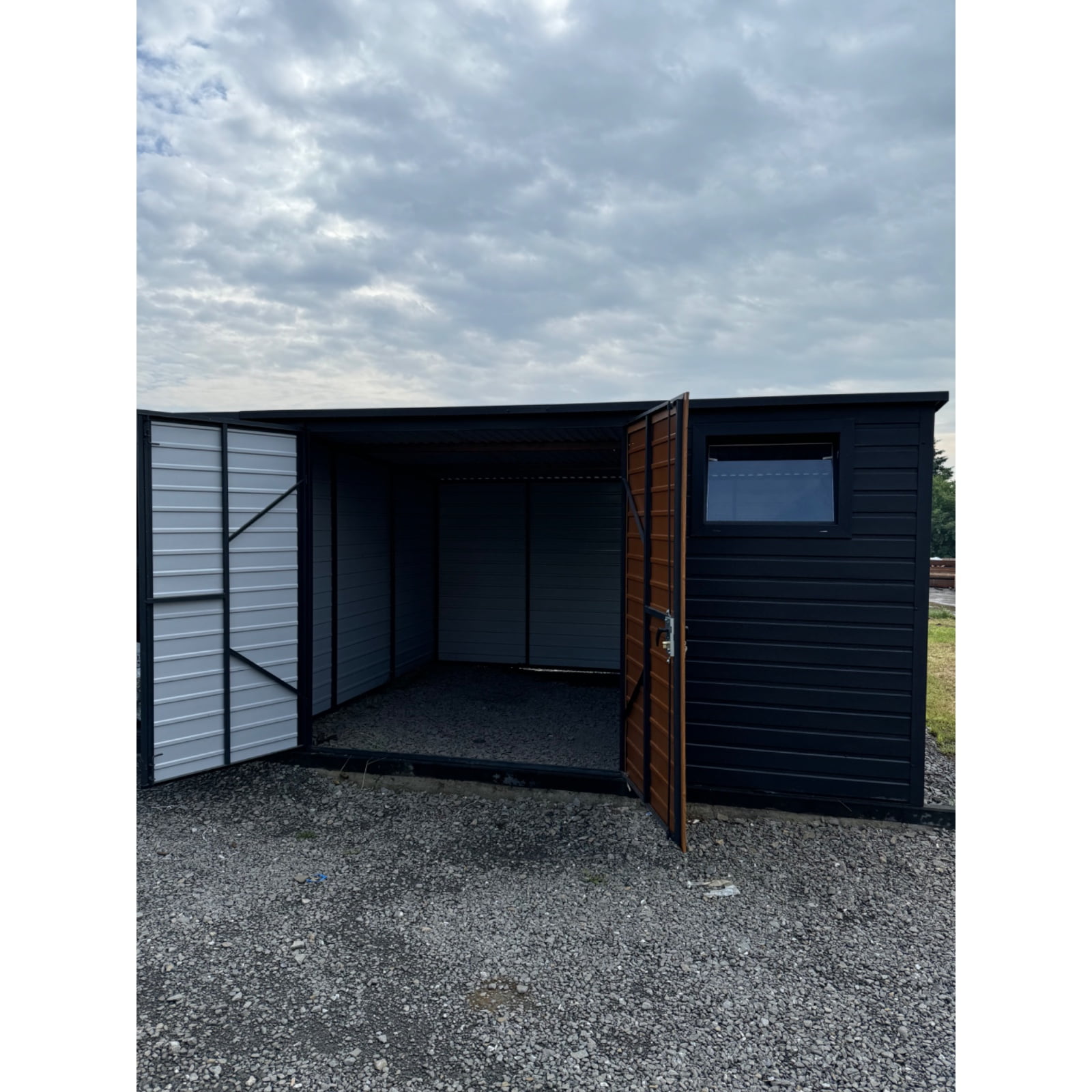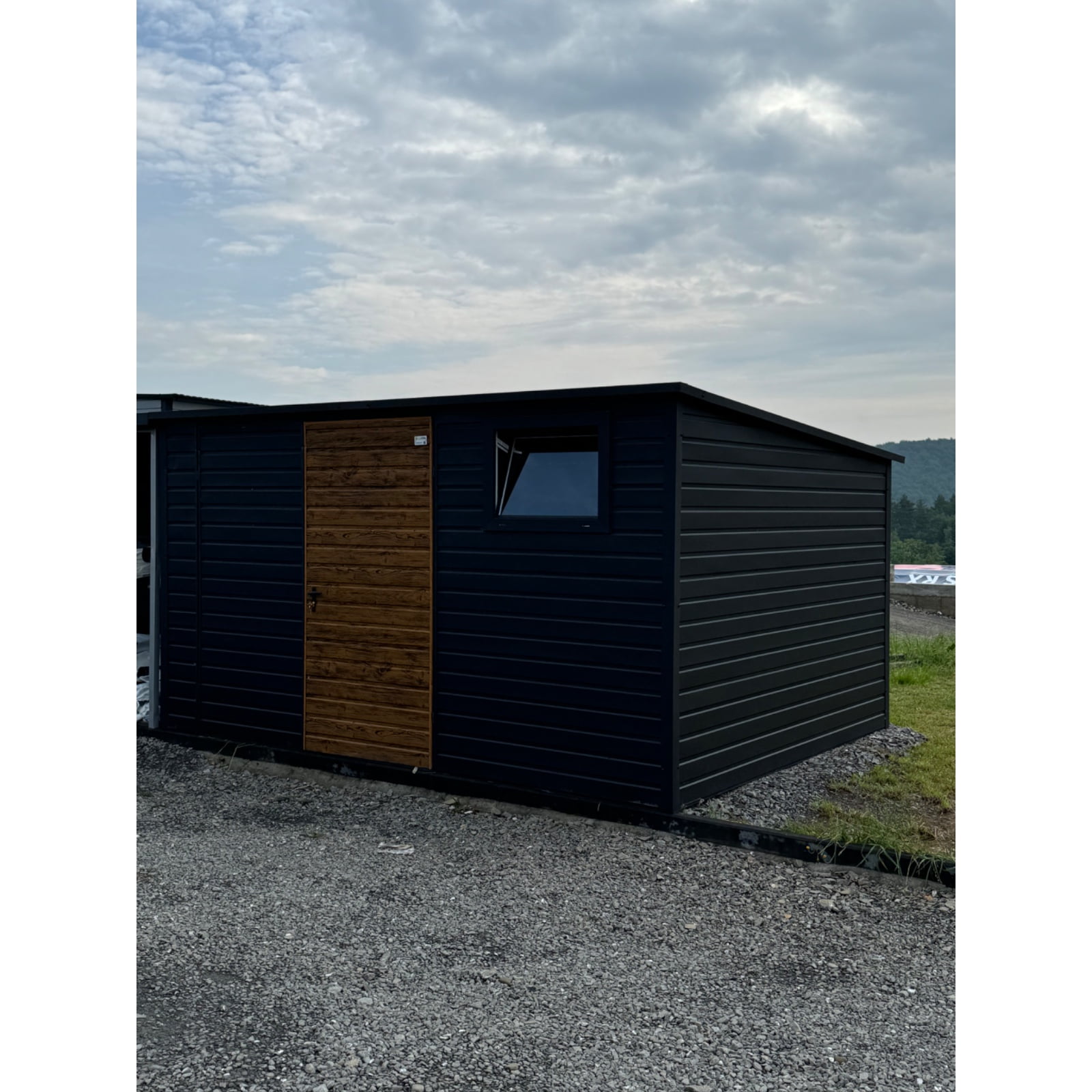Záhradný domček 4x4m z trapézového plechu pozinkovaný v čiernej farbe. Strecha konštrukcie je jednostranná do zadnej časti domu pokrytá trapézovým plechom. To je veľká výhoda v prípade silného dažďa alebo sneženia. Záhradný domček je navyše vybavený plastovým oknom s rozmermi 80x60. Zaisťuje veľmi dobré denné osvetlenie miestnosti v zamračených dňoch. Je ideálny na uloženie záhradného náradia, ako je kosačka na trávu, fúrik, záhradný nábytok alebo gril či bazén. Dá sa použiť aj ako úložný priestor na pneumatiky alebo bicykle. Kvalitná antikorózna farba poskytne ochranu pred hrdzavením kovových profilov po mnoho rokov. Záhradný domček ochráni všetky predmety v ňom uložené pred nepriaznivými poveternostnými podmienkami v lete aj v zime. Dvojkrídlové vchodové dvere zo zlatého dubu sú zamknuté a ochránia pred neželanými hosťami. Vo vnútri miestnosti môžeme police umiestniť podľa nášho vkusu a veľkostí. Zvyšný priestor je možné využiť s pracovným stolom pre domácich majstrov. Výhody záhradného domčeka sú predovšetkým: