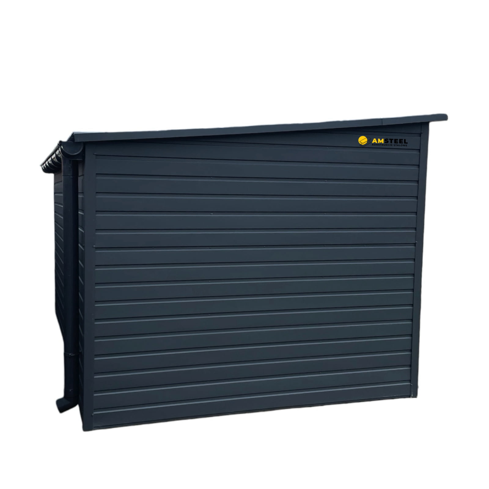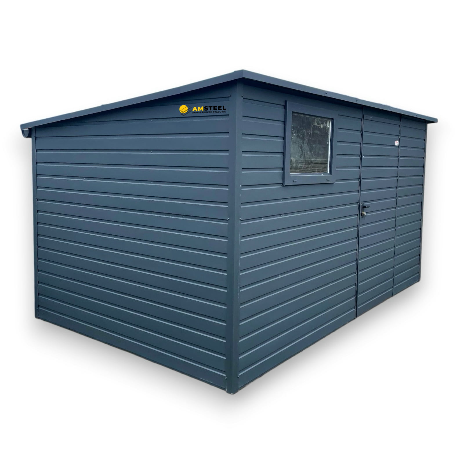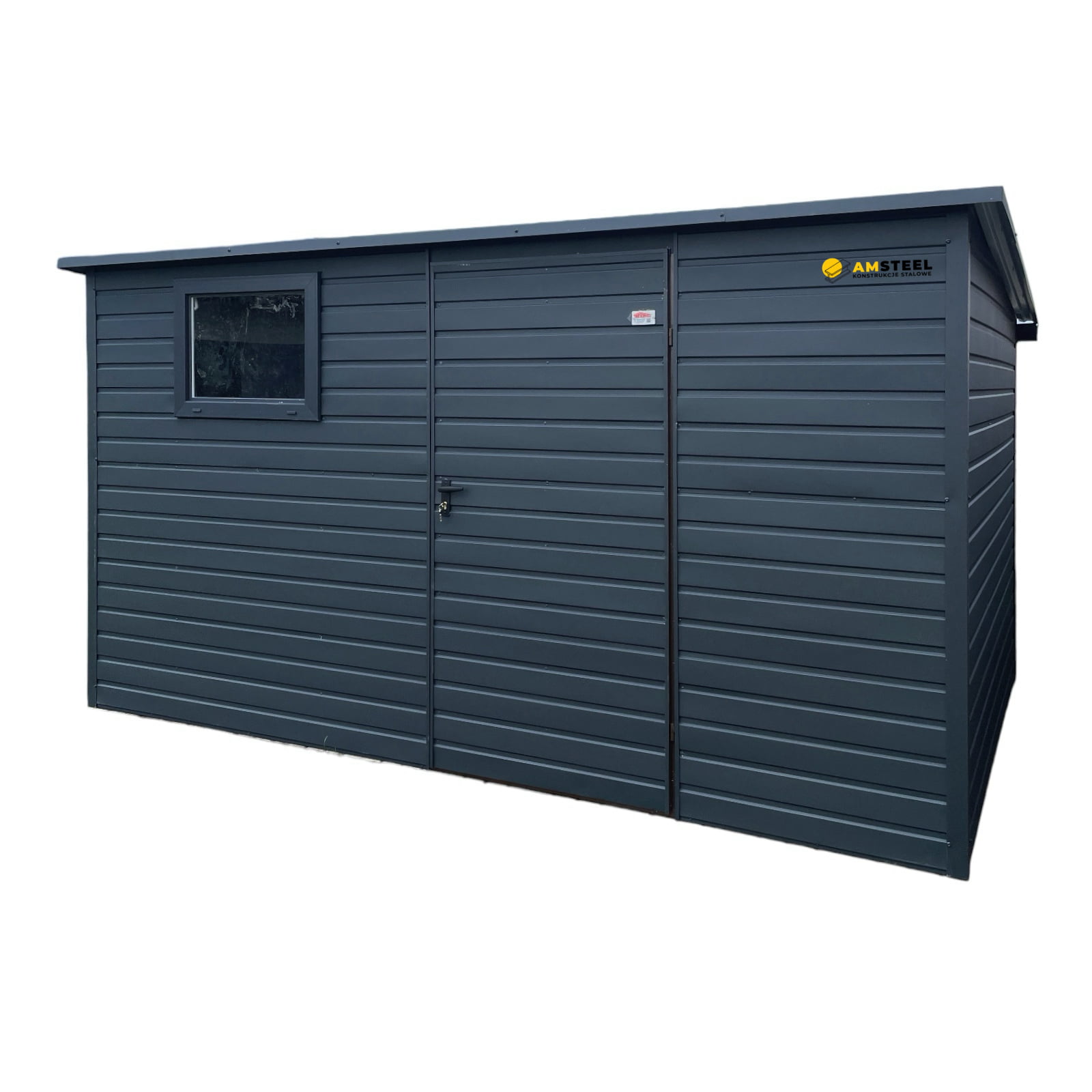 Záhradný domček 4x4m z trapézového plechu pozinkovaného v grafitovej farbe. Strecha konštrukcie je jednostranná do zadnej časti domu pokrytá trapézovým plechom. To je veľká výhoda v prípade silného dažďa alebo sneženia. Záhradný domček je navyše vybavený plastovým oknom s rozmermi 80x60. Zaisťuje veľmi dobré denné osvetlenie miestnosti v zamračených dňoch. Je ideálny na uloženie záhradného náradia, ako je kosačka na trávu, fúrik, záhradný nábytok alebo gril či bazén. Dá sa použiť aj ako úložný priestor na pneumatiky alebo bicykle. Kvalitná antikorózna farba poskytne ochranu pred hrdzavením kovových profilov po mnoho rokov. Záhradný domček ochráni všetky predmety v ňom uložené pred nepriaznivými poveternostnými podmienkami v lete aj v zime. Jednokrídlové vchodové dvere z grafitu ochránia pred nežiaducimi hosťami. Vo vnútri miestnosti môžeme police umiestniť podľa nášho vkusu a veľkostí. Zvyšný priestor je možné využiť s pracovným stolom pre domácich majstrov. Výhody záhradného domčeka sú predovšetkým: