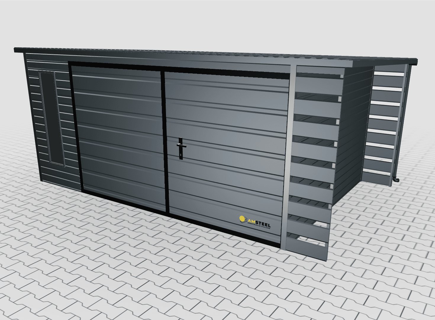 Záhradný domček na náradie z trapézového pozinkovaného plechu v grafitovej farbe s rozmermi 5x3 m s drevárňou vpravo. Strecha konštrukcie je jednostranná pokrytá trapézovým plechom a chráni konštrukciu v prípade silného dažďa alebo sneženia. Záhradný domček je navyše vybavený plastovým oknom 40x150. V zamračených dňoch zabezpečia denné osvetlenie miestnosti. Je ideálny na uloženie záhradného náradia, ako je kosačka na trávu, fúrik, záhradný nábytok alebo gril či bazén. Dá sa použiť aj ako úložný priestor na pneumatiky alebo bicykle. Oceľová konštrukcia chránená proti korózii zaisťuje stabilitu a bezproblémové používanie. Záhradný domček ochráni všetky predmety v ňom uložené pred nepriaznivými poveternostnými podmienkami v lete aj v zime. Uzamykateľné dvojkrídlové vchodové dvere s rozmermi 200x200cm ochránia pred nežiaducimi hosťami. Vo vnútri miestnosti môžeme police umiestniť podľa nášho vkusu a veľkostí. Zvyšný priestor je možné využiť s pracovným stolom pre domácich majstrov. Výhody záhradného domčeka sú predovšetkým: