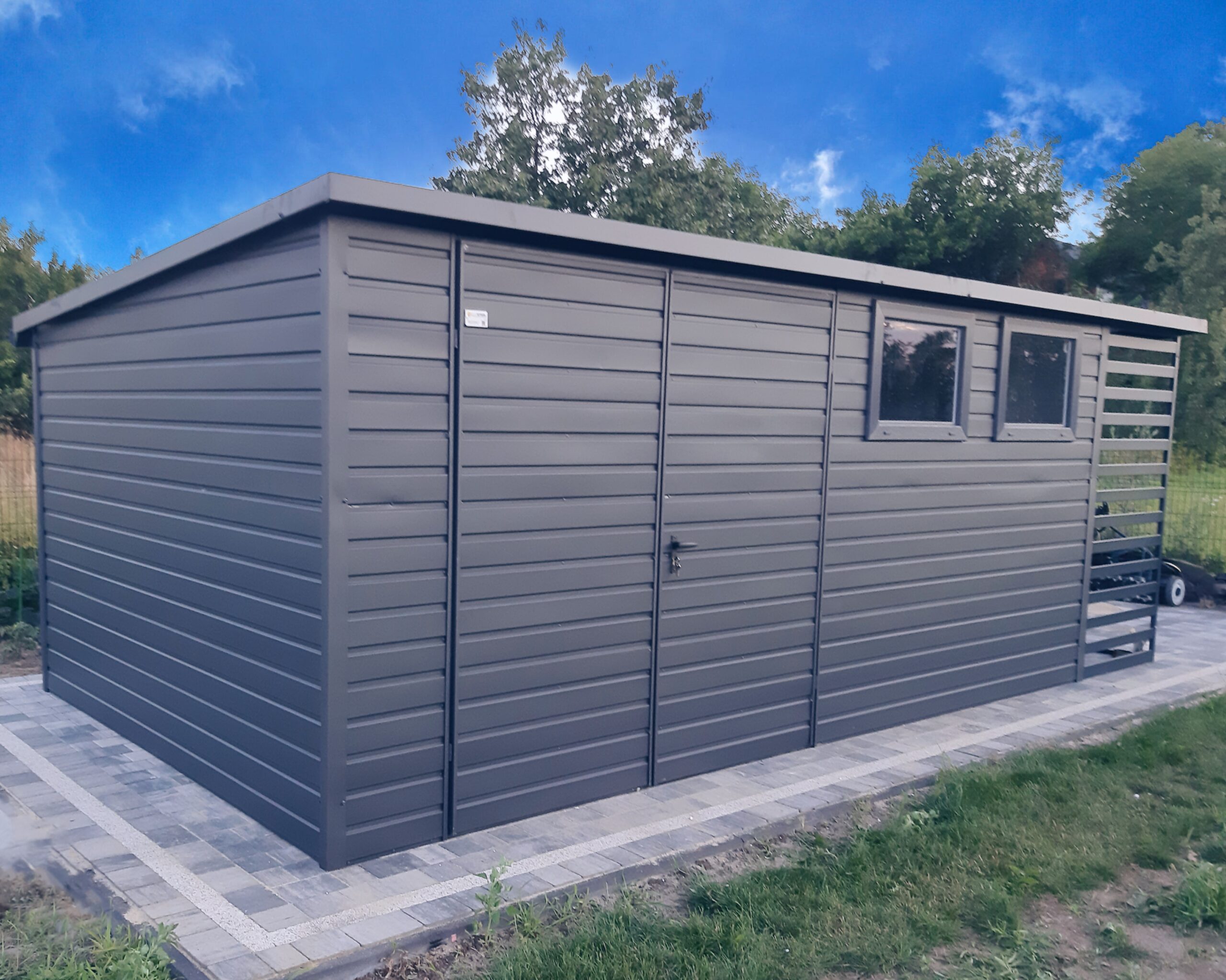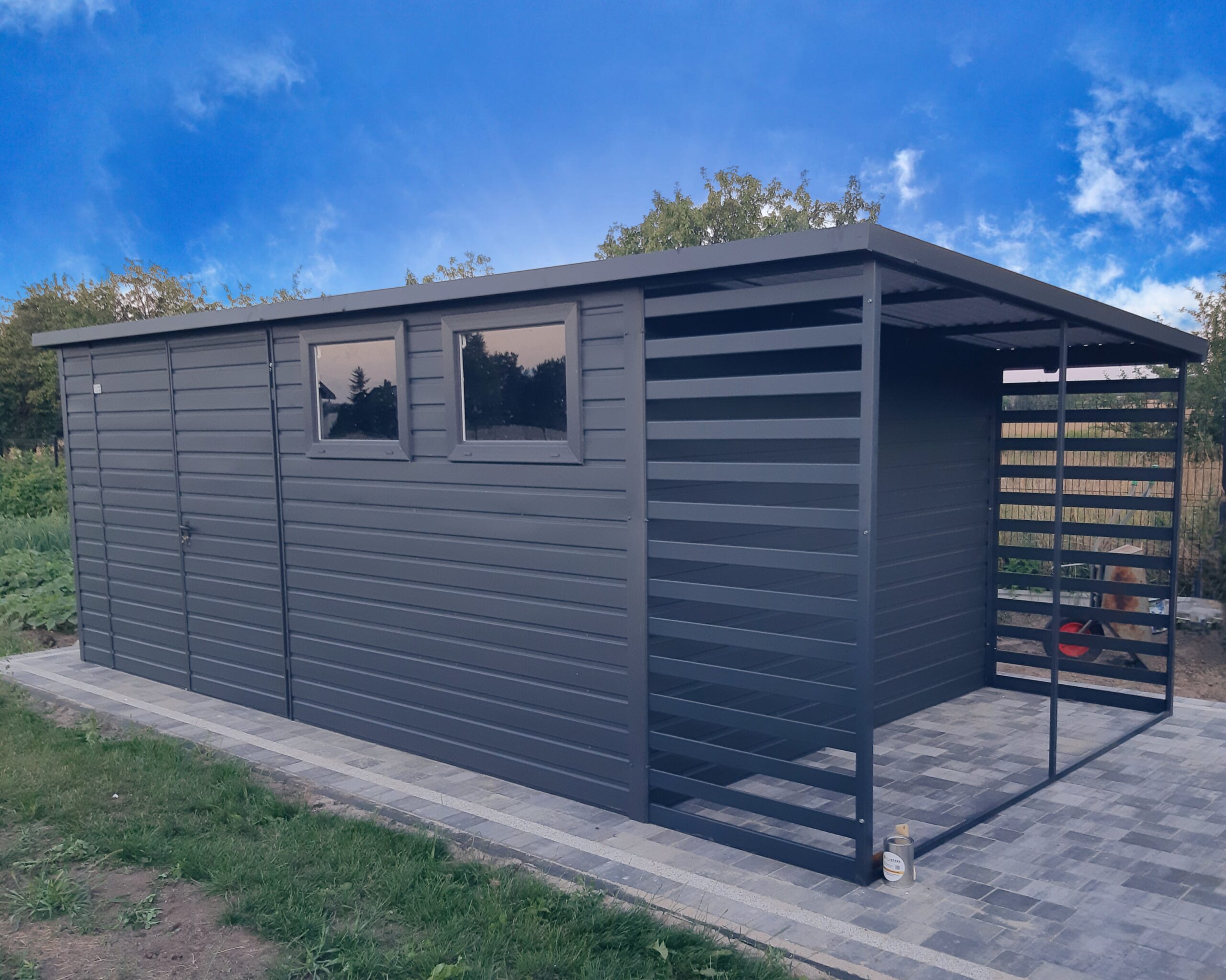 Záhradný domček na náradie z pozinkovaného trapézového plechu grafitovej farby s rozmermi 6x3,5 m s drevárňou vpravo. Strecha konštrukcie je jednostranná pokrytá trapézovým plechom, čo je veľká výhoda v prípade silných dažďov alebo sneženia. Inštalované žľaby zabezpečia, že voda odteká zo strechy na akékoľvek miesto na pozemku. Záhradný domček je navyše vybavený dvoma plastovými oknami s rozmermi 80x60. V zamračených dňoch zabezpečia denné osvetlenie miestnosti. Je ideálny na uloženie záhradného náradia, ako je kosačka na trávu, fúrik, záhradný nábytok alebo gril či bazén. Dá sa použiť aj ako úložný priestor na pneumatiky alebo bicykle. Oceľová konštrukcia chránená proti korózii zaisťuje stabilitu a bezproblémové používanie. Kvalitná antikorózna farba poskytne ochranu pred hrdzavením kovových profilov po mnoho rokov. Záhradný domček ochráni všetky predmety v ňom uložené pred nepriaznivými poveternostnými podmienkami v lete aj v zime. Uzamykateľné dvojkrídlové vchodové dvere s rozmermi 200x200cm ochránia pred nežiaducimi hosťami. Vo vnútri miestnosti môžeme police umiestniť podľa nášho vkusu a veľkostí. Zvyšný priestor je možné využiť s pracovným stolom pre domácich majstrov. Výhody záhradného domčeka sú predovšetkým: